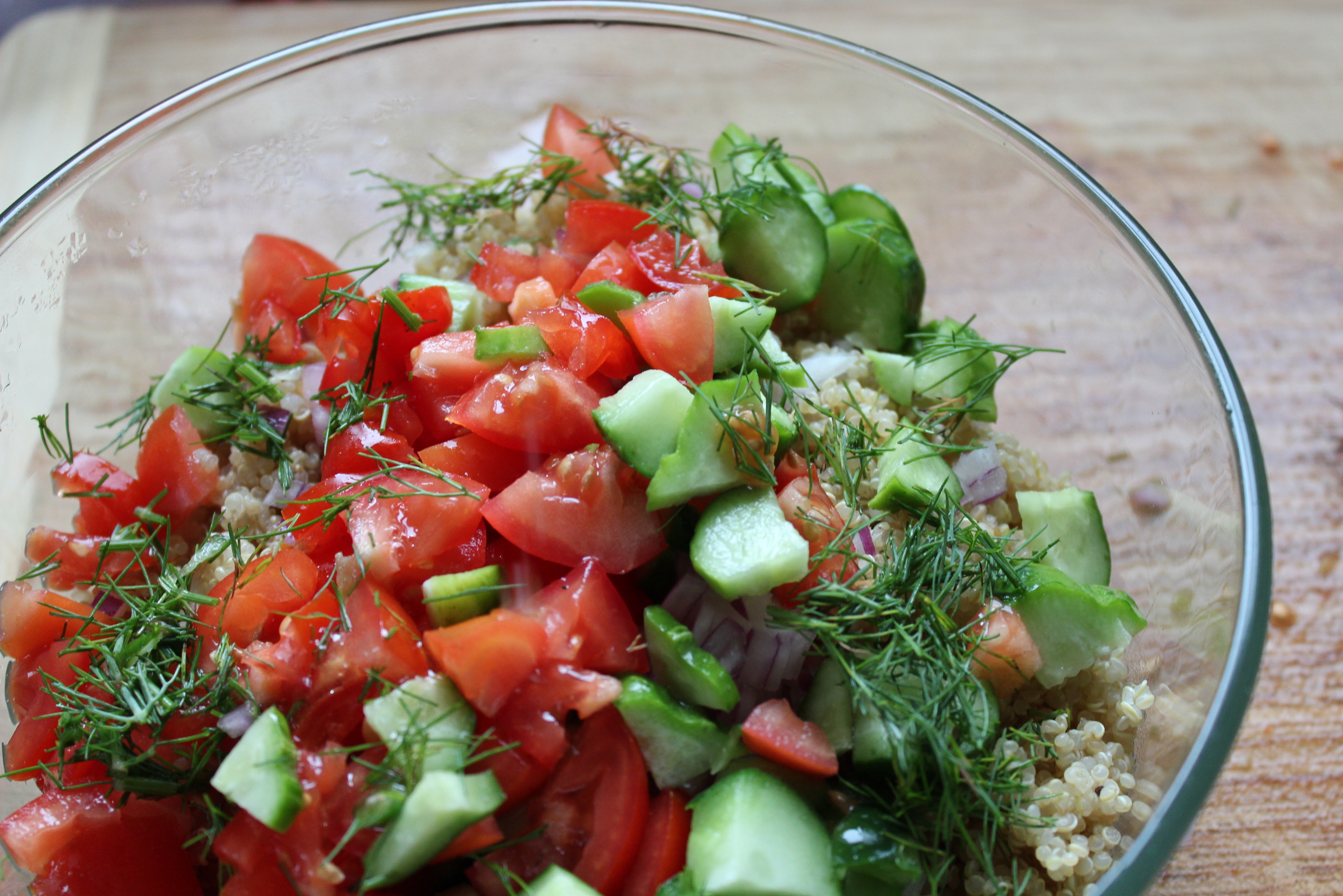 - Once the quinoa is done, spoon it into a salad bowl and add the cucumbers, tomatoes, onion, and dill. Swirl the dressing over the salad and toss to lightly coat the quinoa and vegetables in the garlicky oil.