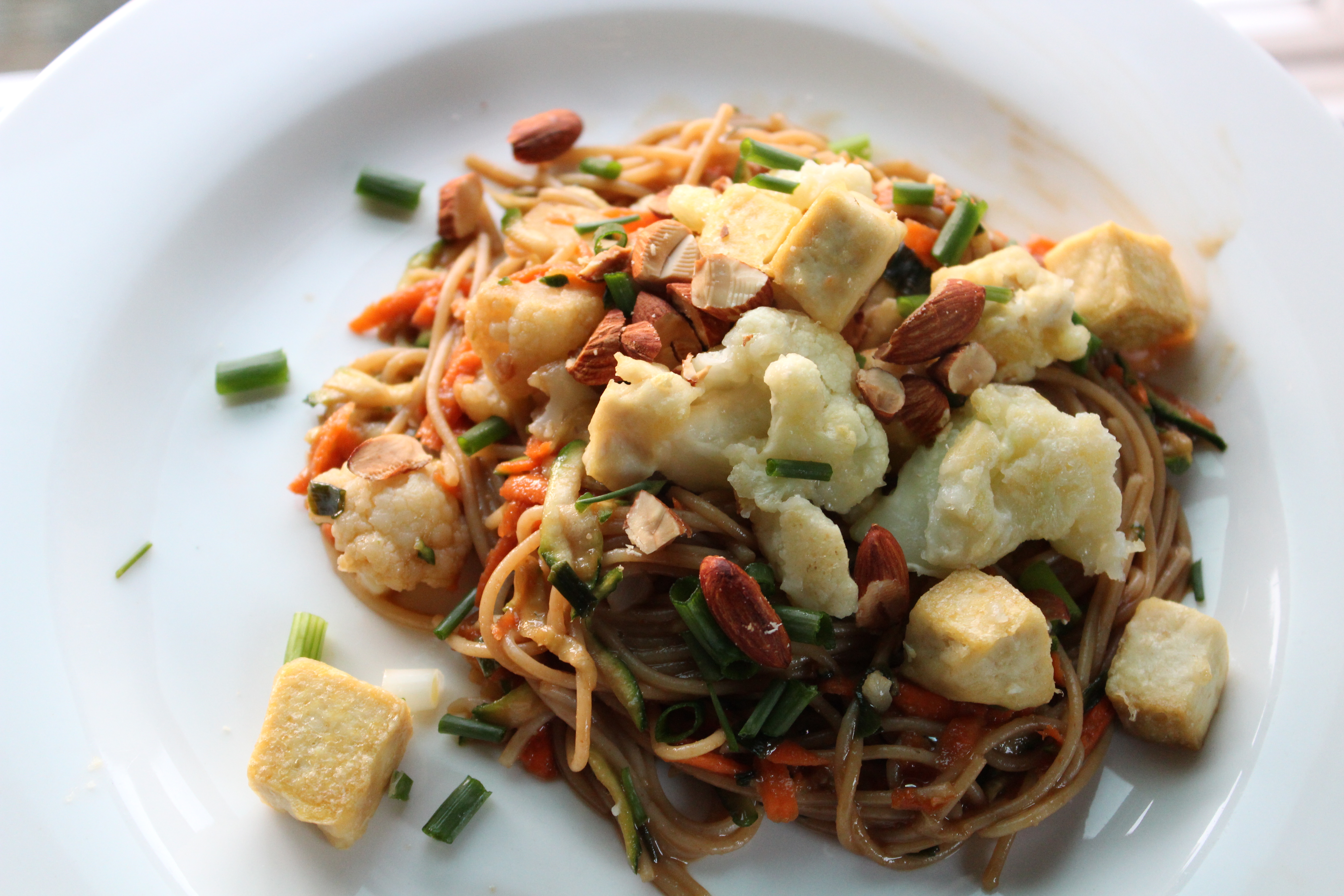 - When the noodles are cooked al dente, drain them well, then immediately add the shredded carrot and zucchini, sauce, cauliflower, and tofu. Toss quickly to combine, then replace the lid on the saucepan and let sit1 to 2 minutes, to allow the carrot and zucchini to cook slightly.