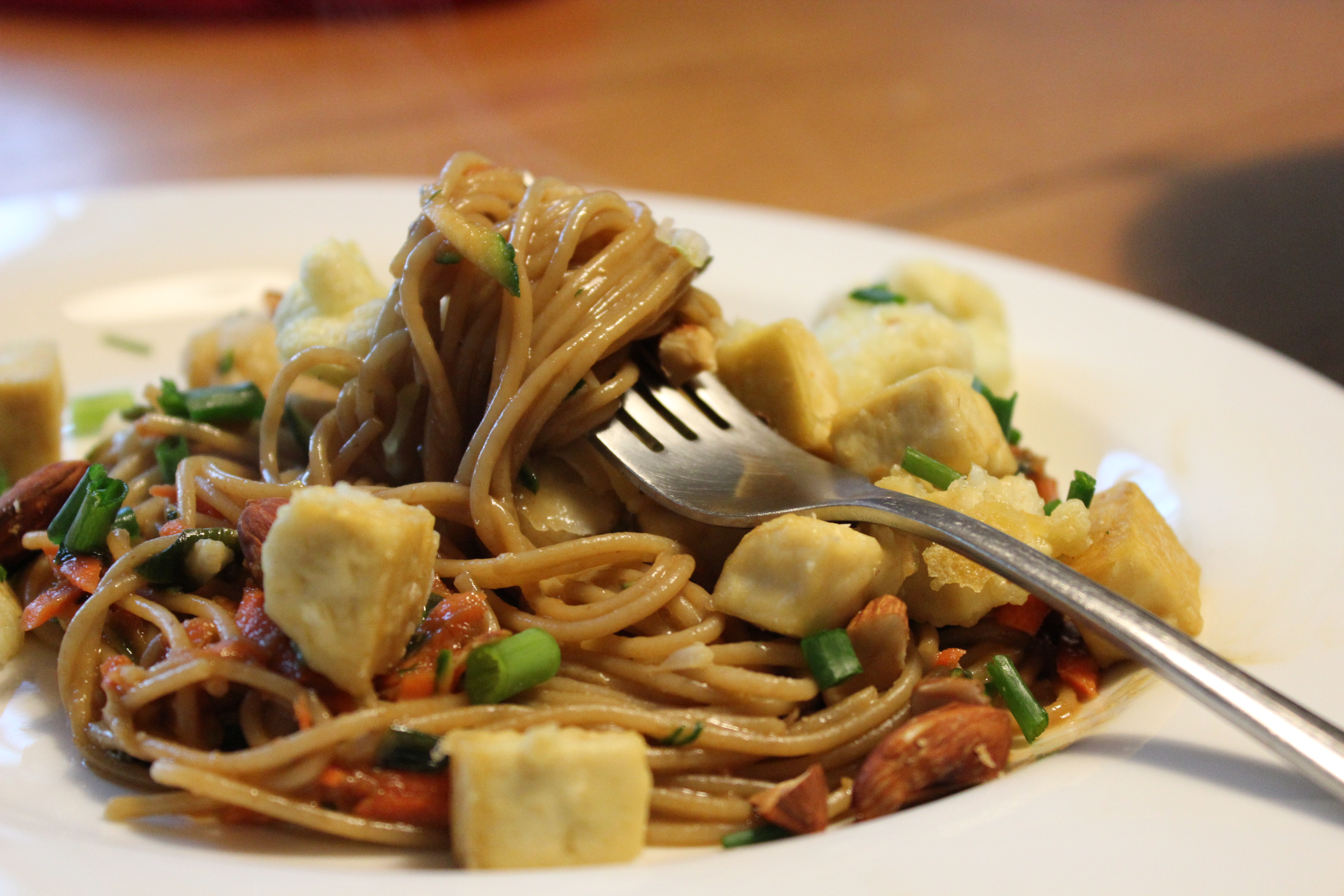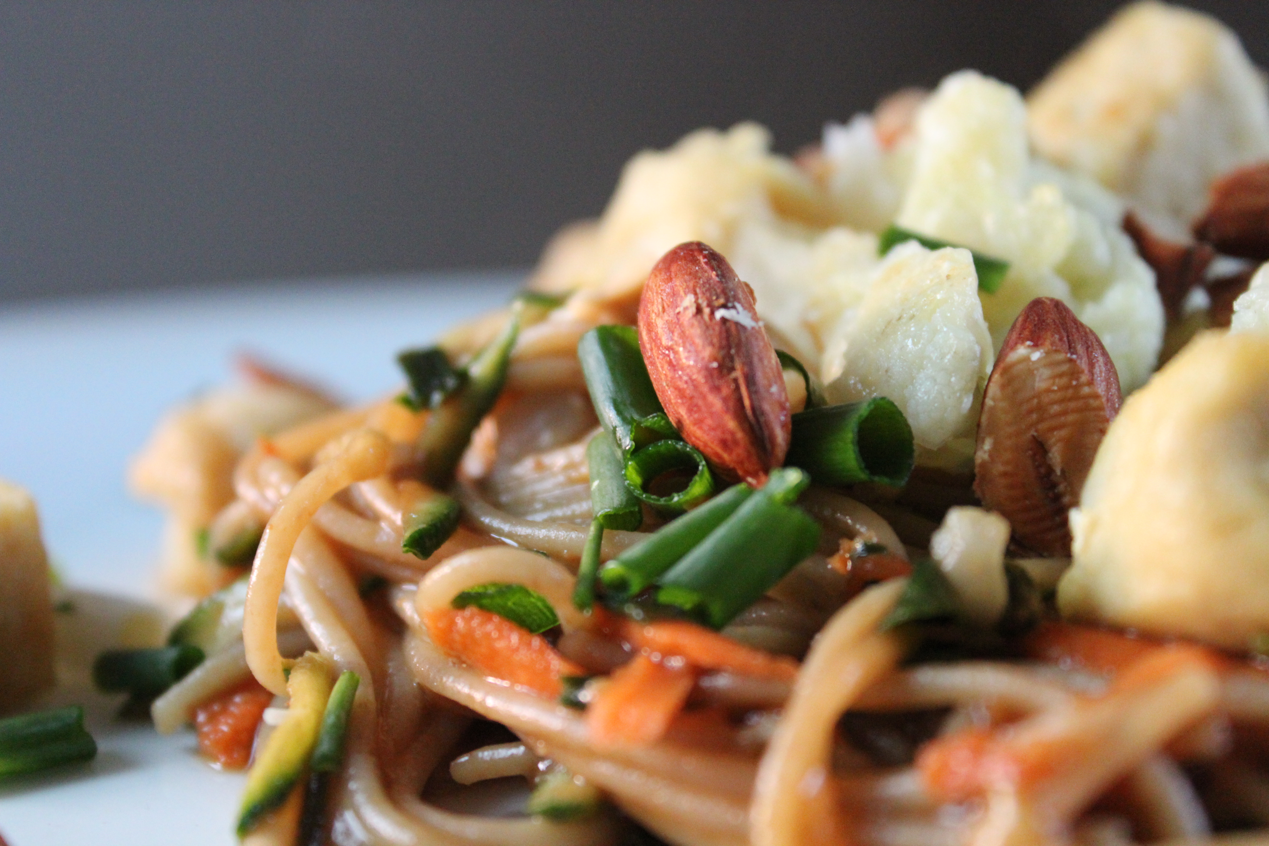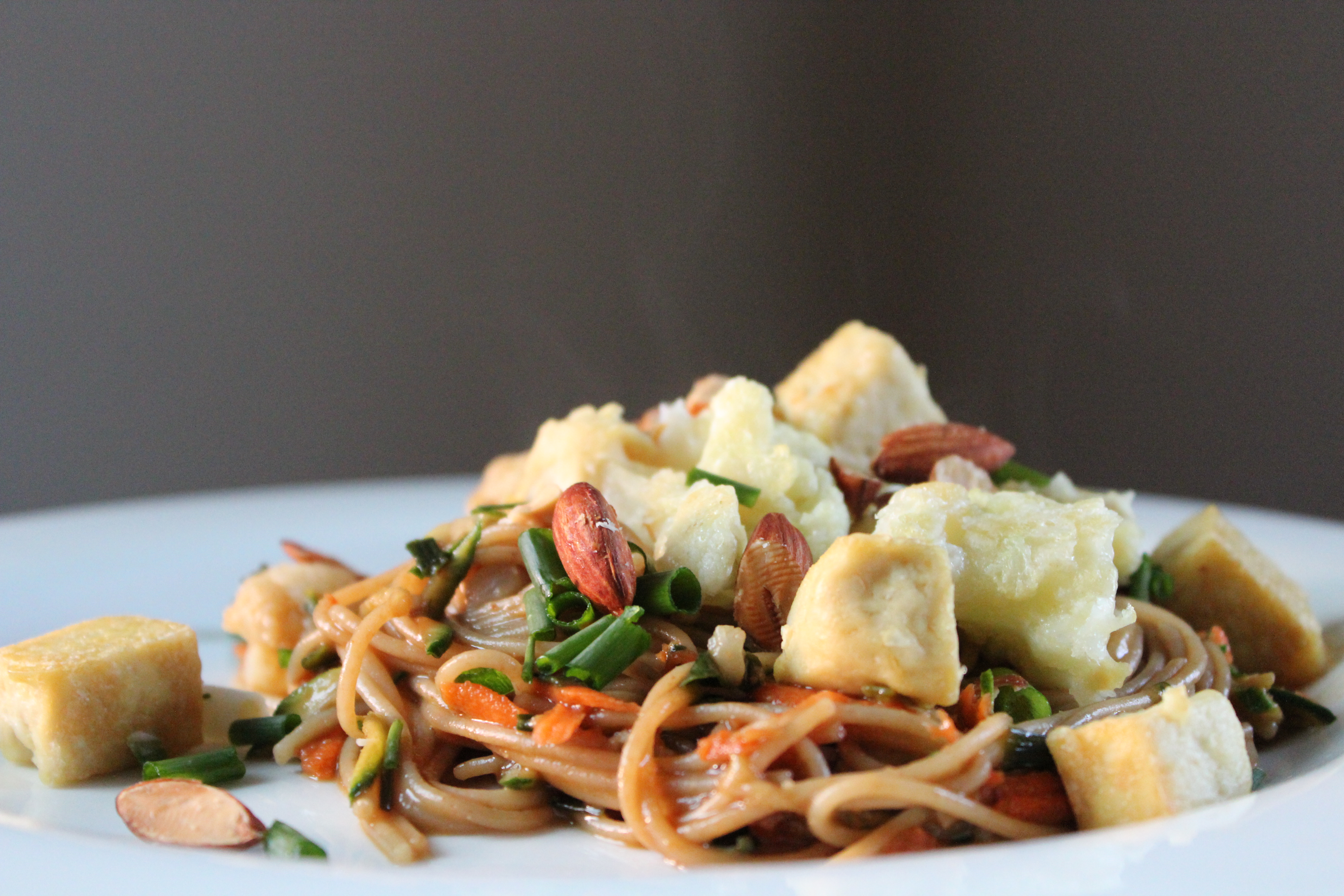 This dish combines a sweet and spicy peanut sauce with tender noodles and crisp vegetables. Shredded carrots and zucchini are added in just before serving, which means they retain some of their crunch. Golden chunks of cauliflower and tofu, both of which have been breaded and roasted, add substance and protein. Top it off with chopped, roasted almonds and green onions, and this is a complete meal in a bowl. Feel free to use a whole head of cauliflower and leave out the tofu, if desired, or vice versa. Also, note that the red pepper flakes can be omitted or reduced for younger palates or those with a low heat tolerance, but they give a pleasant warmth and kick to the sauce.