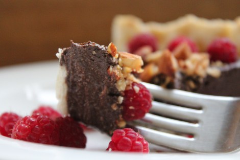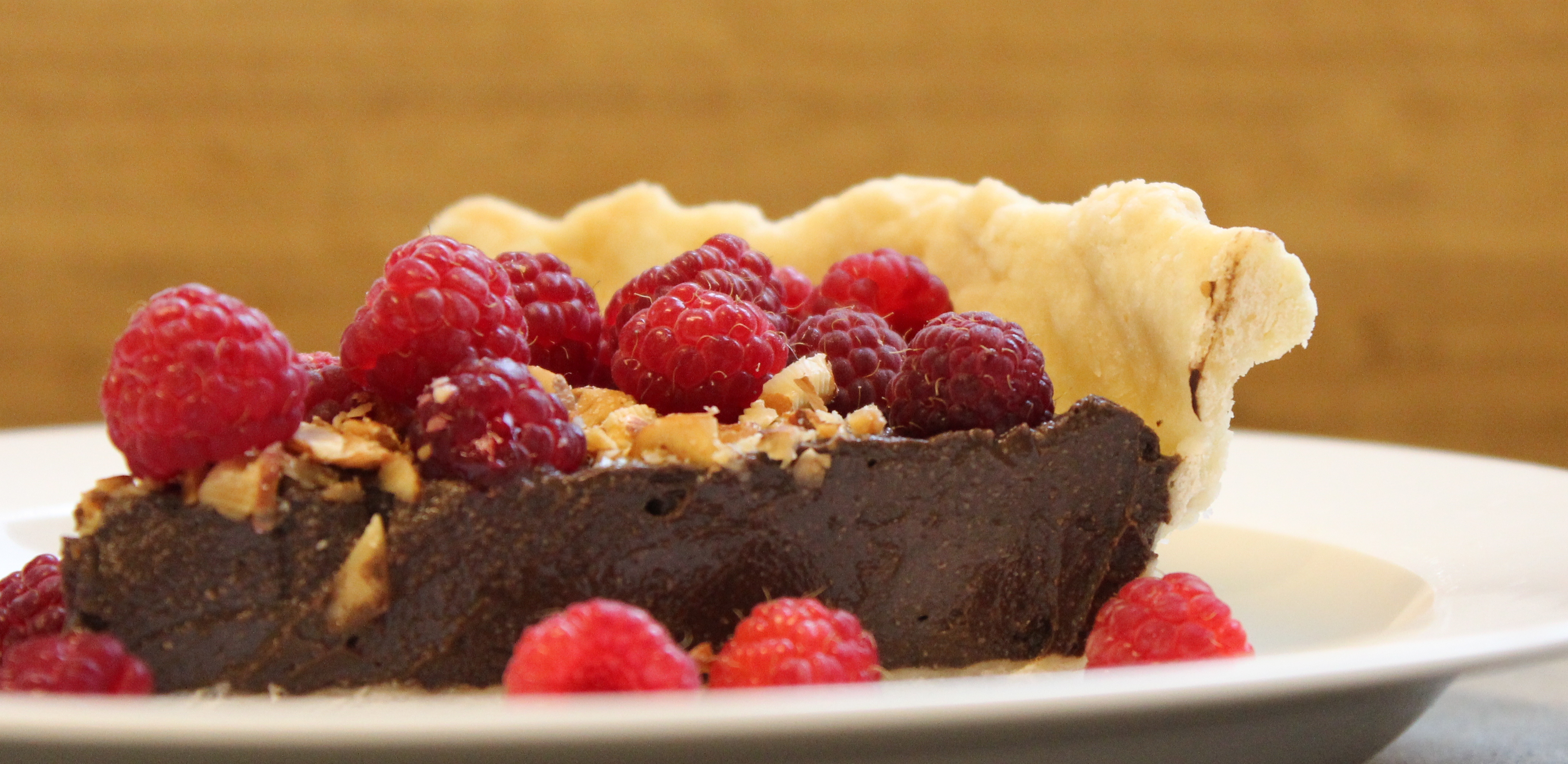 Here, dark chocolate presents itself in a fudge-like mousse. Each forkful is the perfect combination of tender, flaky crust, creamy chocolate, crunchy toasted almonds, and tangy raspberries. Despite its indulgent taste, the mousse filling is fairly guilt-free. For a lighter dessert, serve the mousse in ramekins. You can also reduce the sugar by at least half. For a more decadent and rich dessert, leave out the tofu in the last step. This will reduce the amount of pudding, so plan on using an 8″ pan. Also, without the tofu, the pudding will congeal on top unless covered. Place a piece of plastic wrap over the pie and press against the top of the pudding so no air can reach it. After the filling is set, take a large metal spoon, warm under hot water, and smooth out any wrinkles left from the plastic wrap. If using the tofu, you don’t need to cover it or worry about smoothing out wrinkles. This is on the low side for the amount of filling, so if you’re making a 9″ pie, you should be able to use 150% of this recipe and get most, if not all, of the filling in.