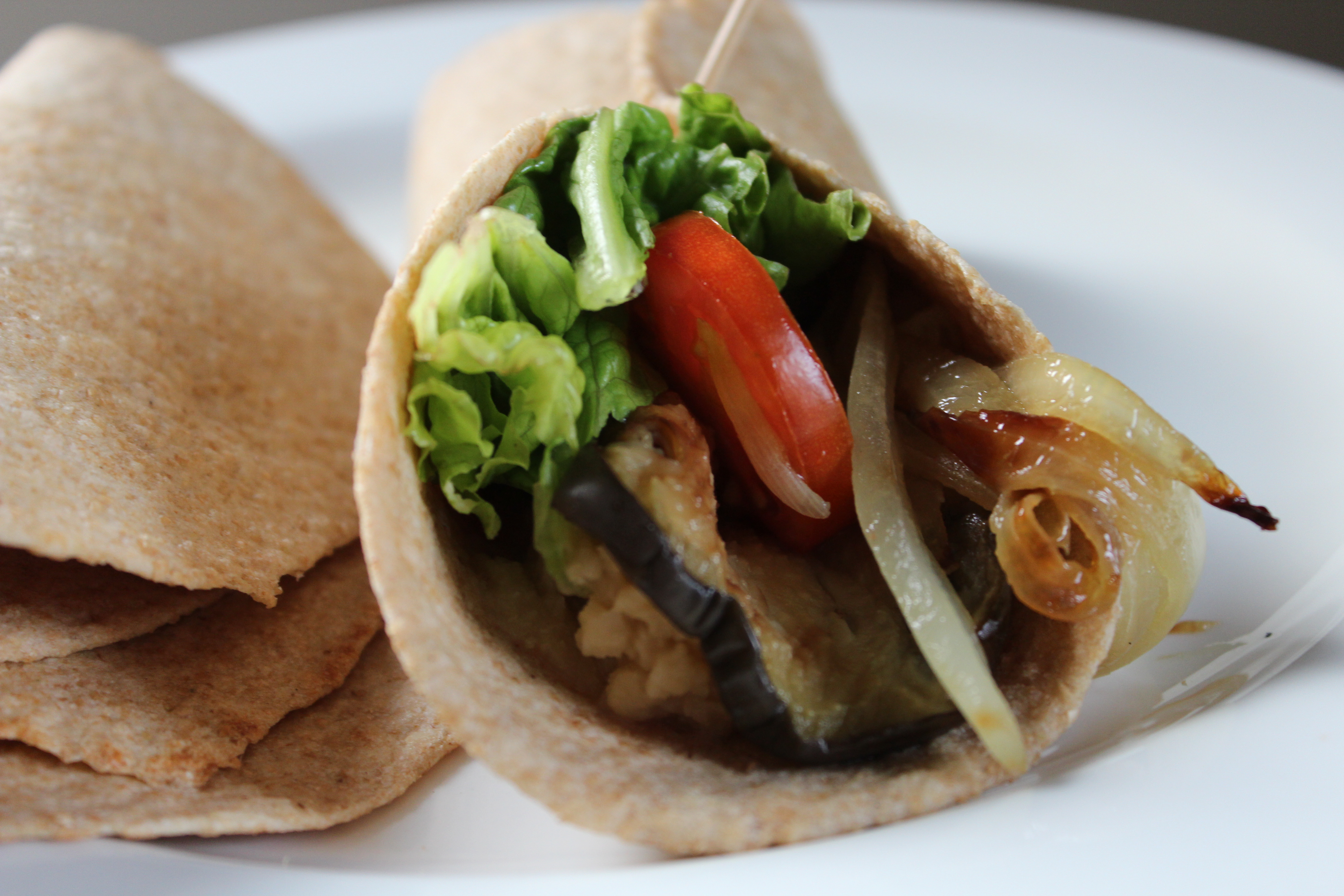 Speed it Up: I’ve given you all the instructions needed to make this entirely from scratch, however, there is a huge amount of wiggle room here. First, as mentioned above, you can use store-bought tortillas or pita bread. You can also use per-packaged hummus, or make it ahead of time. I do think it’s best warm, though, so heat it up if you’re not making it immediately before serving. In addition to the hummus, every other part of these wraps can be prepared in advance, although if you’re making the tortillas, they will be best if made directly before serving. Also, if you plan out your meals ahead of time (like me) to try and maximize your time, double or triple the amount of eggplant you broil and use the rest for this Eggplant Parmigiana recipe.