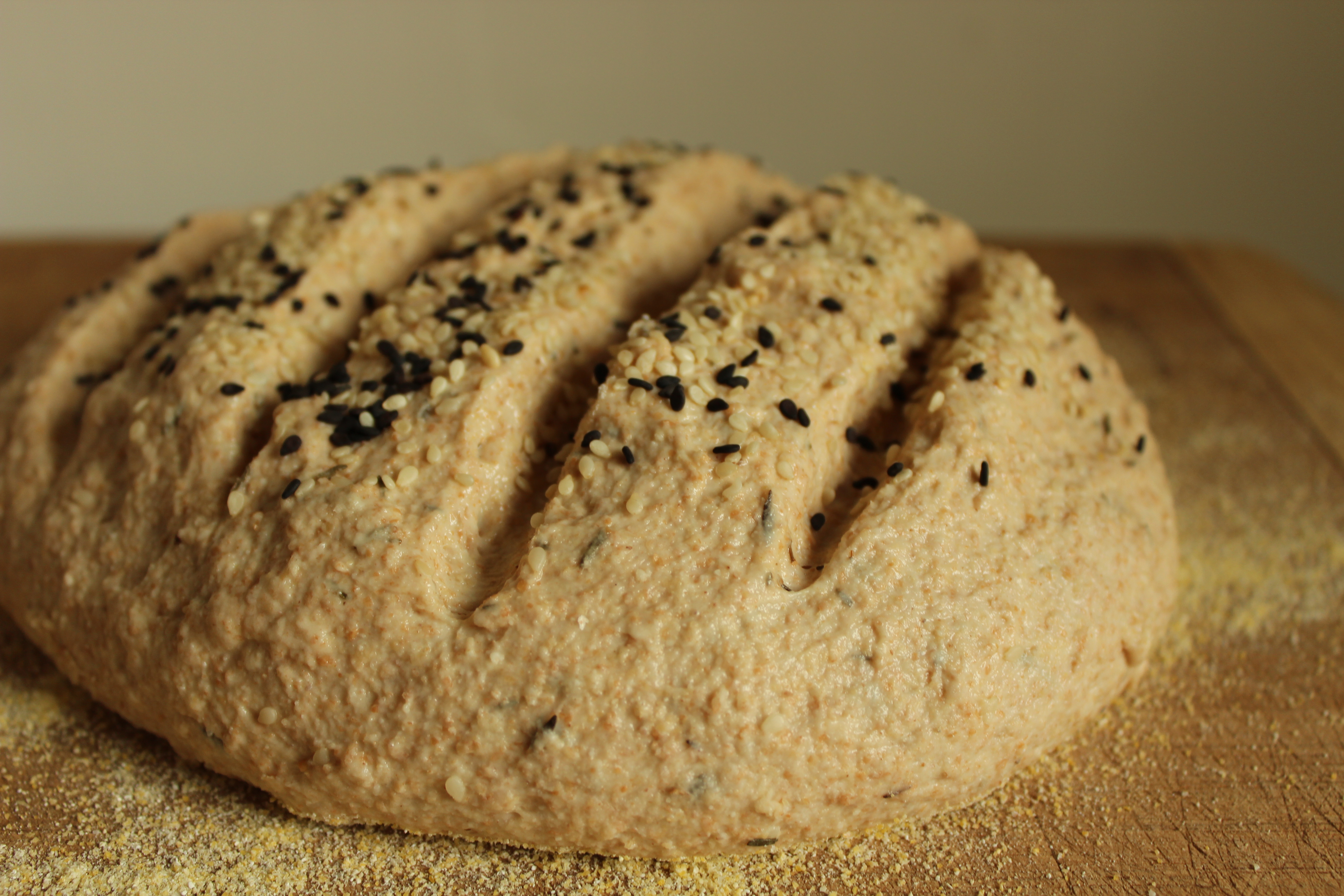 - In 20 minutes, or when the oven is preheated, whichever is later, decorate the loaf: Slide a serrated knife through some flour. Cut four 1” deep gashes across the top of the loaf (or some other pattern if you like). Sprinkle with the sesame seeds and press them gently into the loaf. Brush any loose sesame seeds off the pizza peel so they don’t burn in the oven.