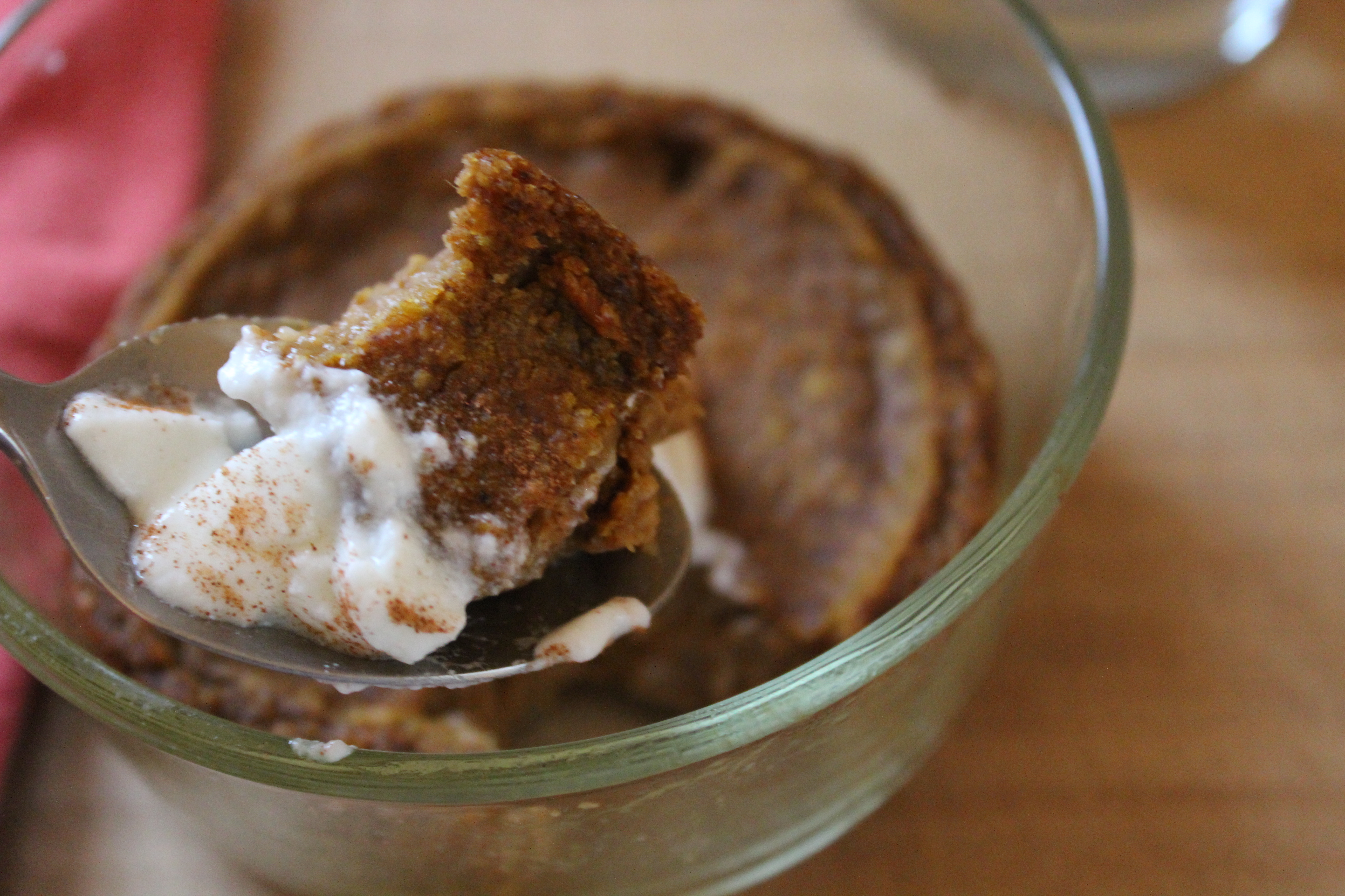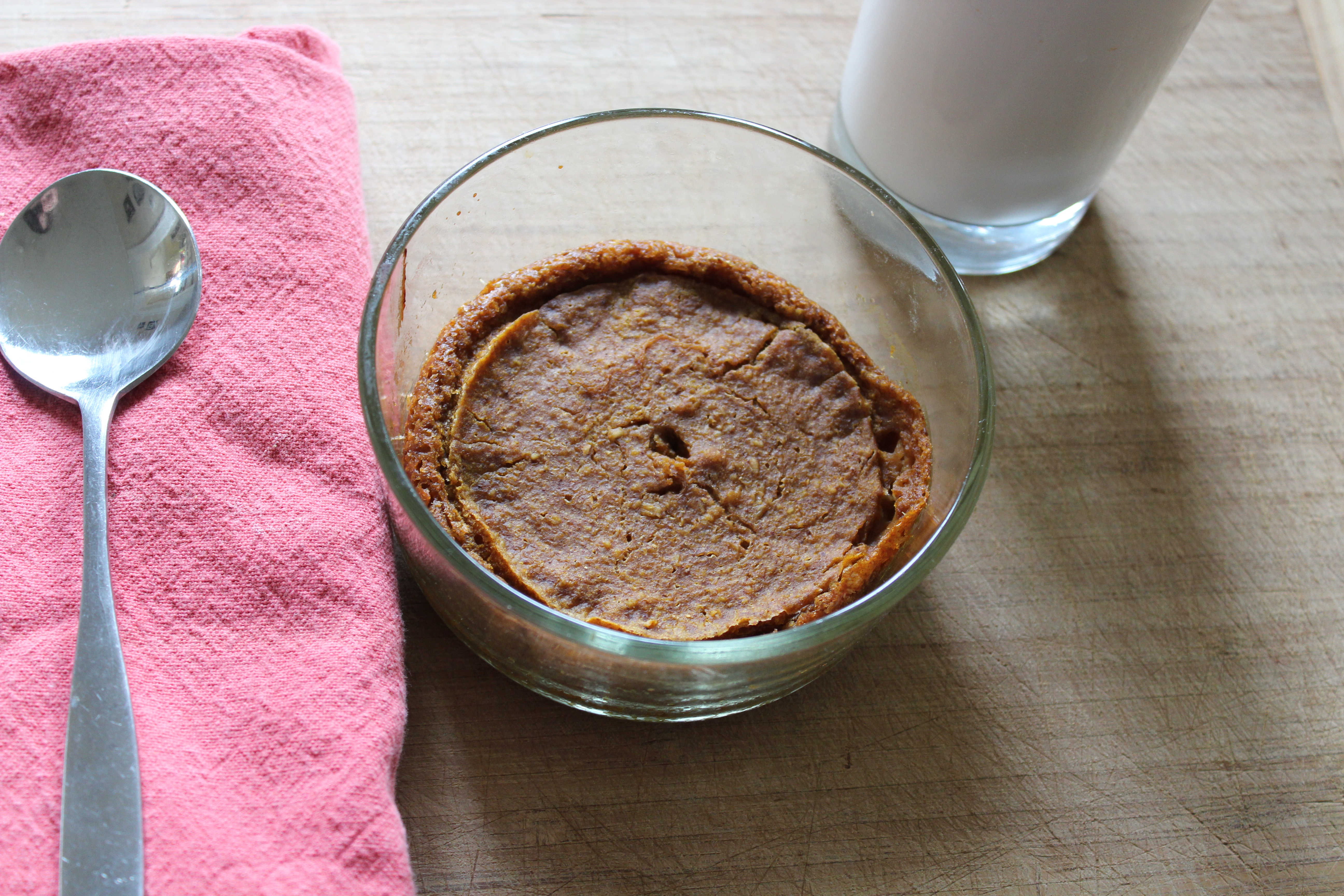 This delicious breakfast has a similar taste and texture to pumpkin pie, but is full of fiber and low in sugar and fat. It’s lovely even plain, but can be dressed up with a dollop of vanilla yogurt or whipped cream. This recipe makes one serving in a 4″ circular pan, but you could split between two small ramekins for smaller servings to go along with something else, or triple for a 9″x5″ bread pan. You can use any type of milk here; I like Almond Breeze original plain almond milk.