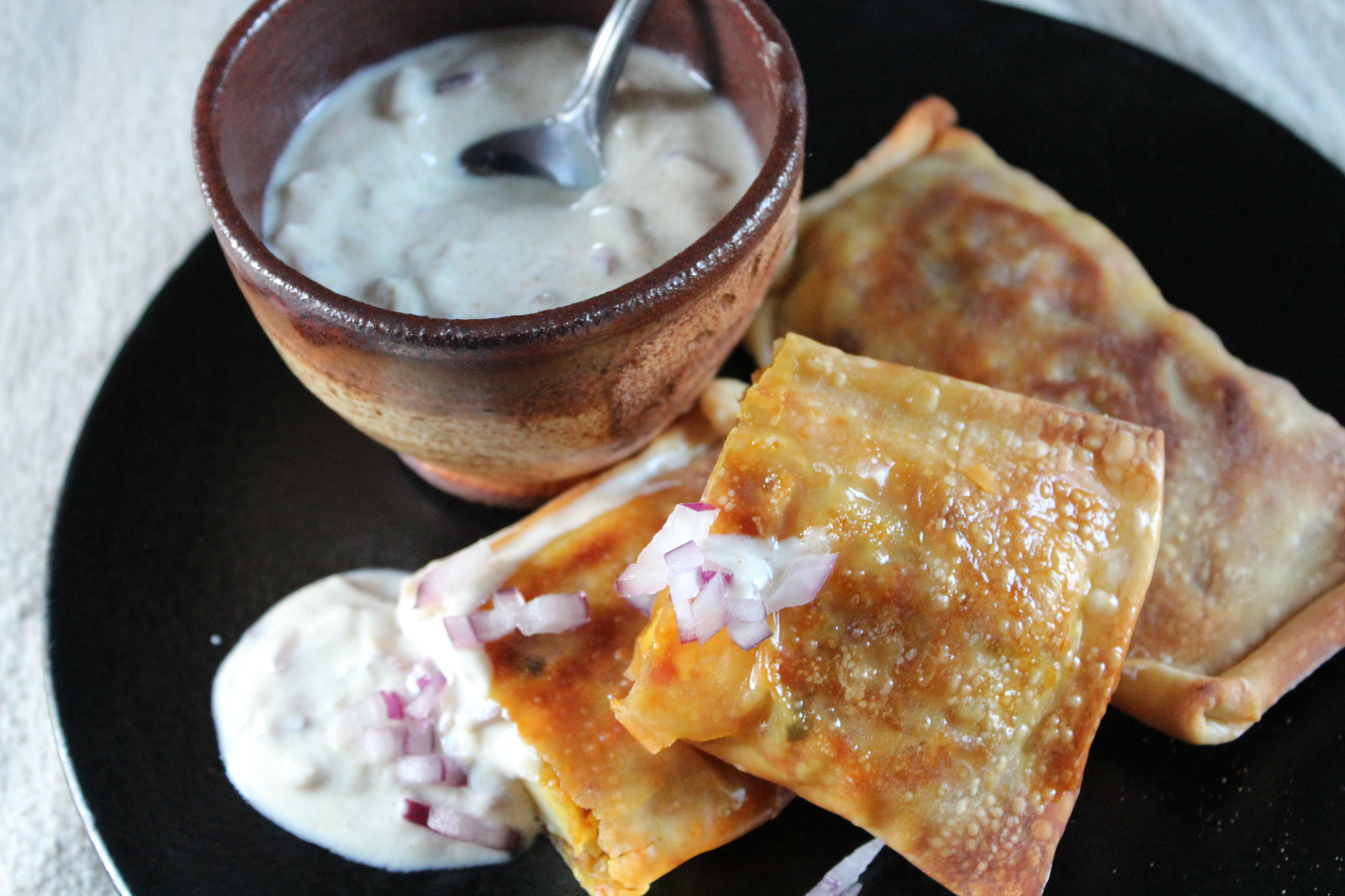 This traditional Afghan dish is delightful as a snack or main dish. The outside crust browns and becomes crisp in the oven, while the inside is soft and savory. The onion, garlic, and cumin combine to create one flavorful bite. The dipping sauce is an absolute most: the creamy, cool consistency compliments the texture and taste of the dumplings perfectly. You can make these completely vegan if you use the vegan version of the sauce. I like these served warm or at room temperature. For a meal, try serving them with a cucumber and yogurt raita or green salad. Also, make sure you use the large egg roll wrappers, not the small ones for won tons.