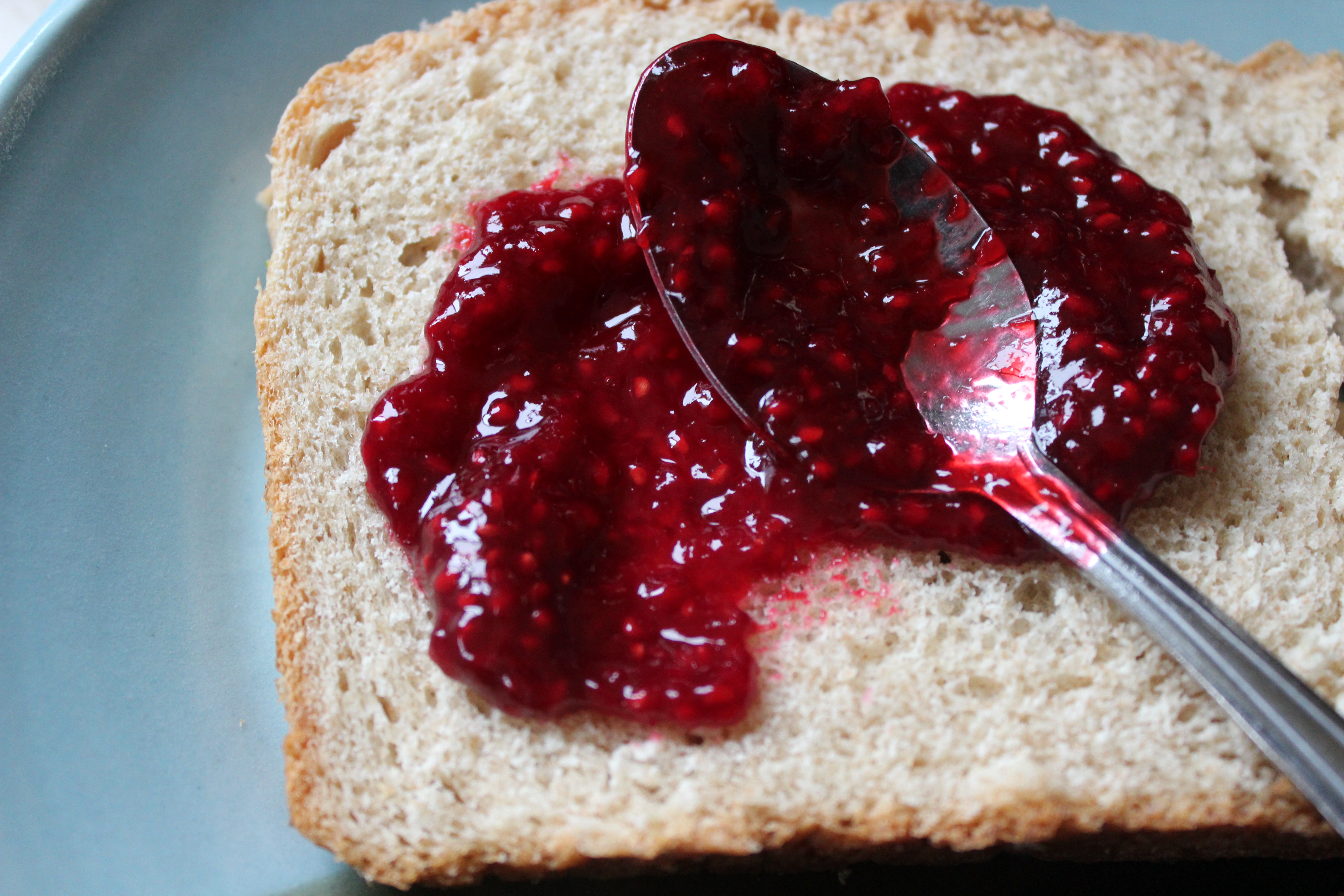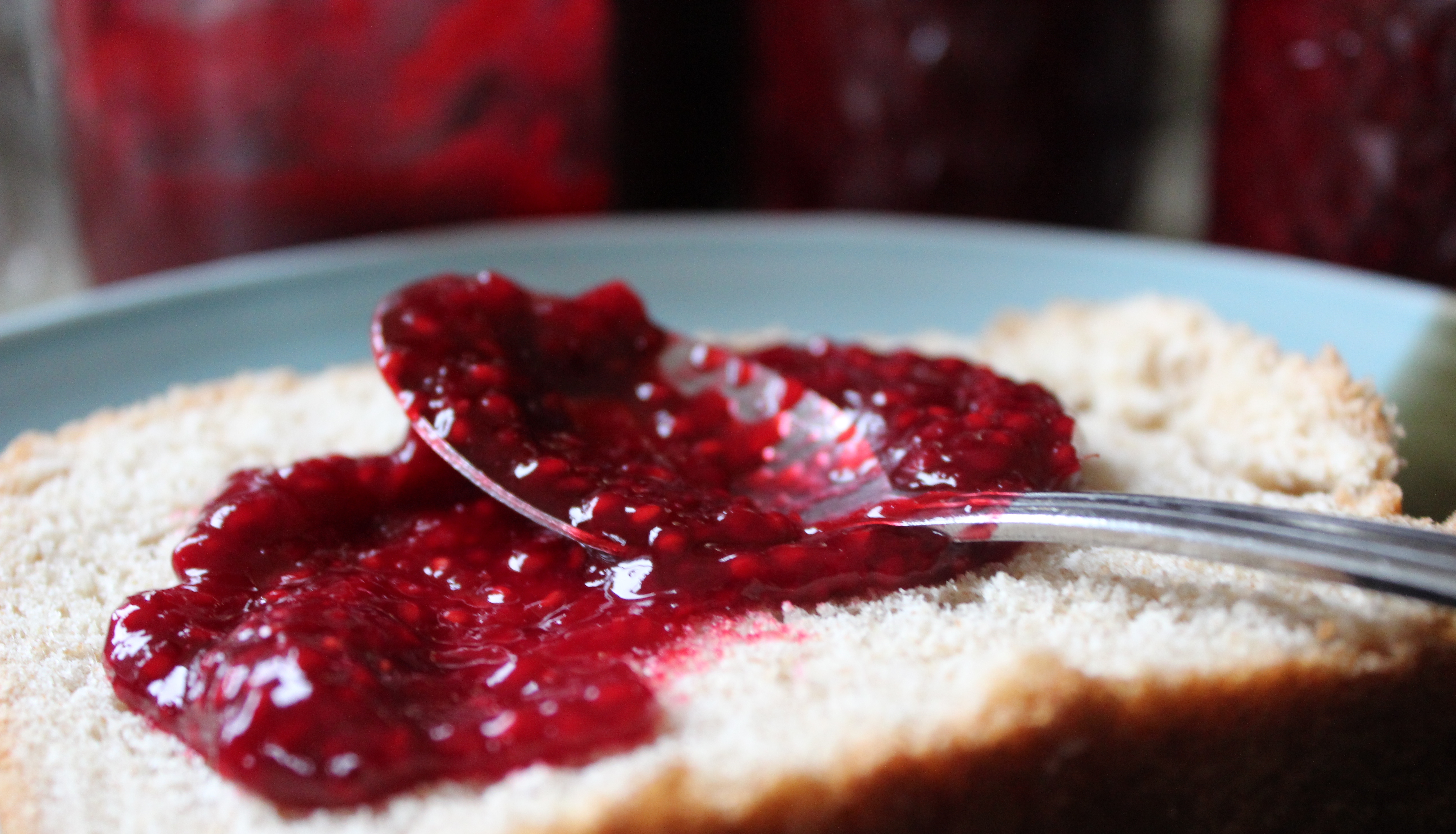 Unlike most jams which are basically sugar with a bit of fruit, this sweet spread is truly berries. It has just enough sugar to give it a delicious sweetness, but it’s still fairly tart. It’s essentially a spoonful of smashed raspberries. It’s wonderful, of course, used in the traditional way on a piece of toast or a muffin, but it’s also great mixed with plain yogurt or, my favorite, eaten by the spoonful straight out of the jar. The butter is not essential; it keeps the jam from foaming while cooking, but it’s fun to skim the foam off and eat it, so by all means omit it if you like. Also, if you freeze the jam in glass jars, as I do, then make sure you leave plenty of headspace—at least 2 inches. The jam will expand as it freezes, and if there is too much in the jar, the glass will crack. This is why the yield is estimated. If you use plastic containers, you can fit far more into each.