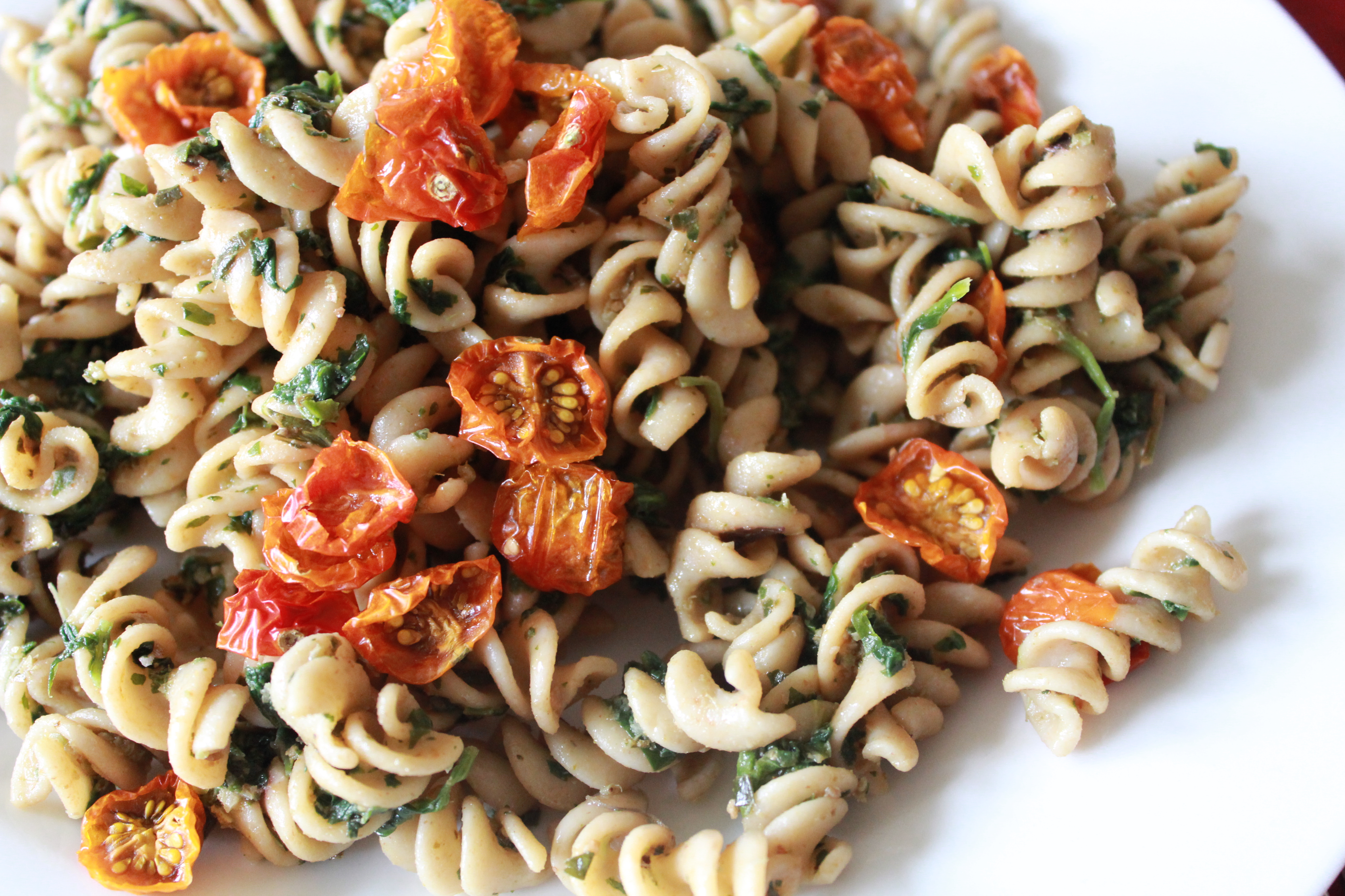 This is a great last-minute, all-in-one dish. The garlicky pesto infuses the pasta with an intense flavor that goes nicely with the concentrated sweetness of the dried tomatoes. Serve it with a green salad or lightly steamed fresh or frozen vegetables, like broccoli.
