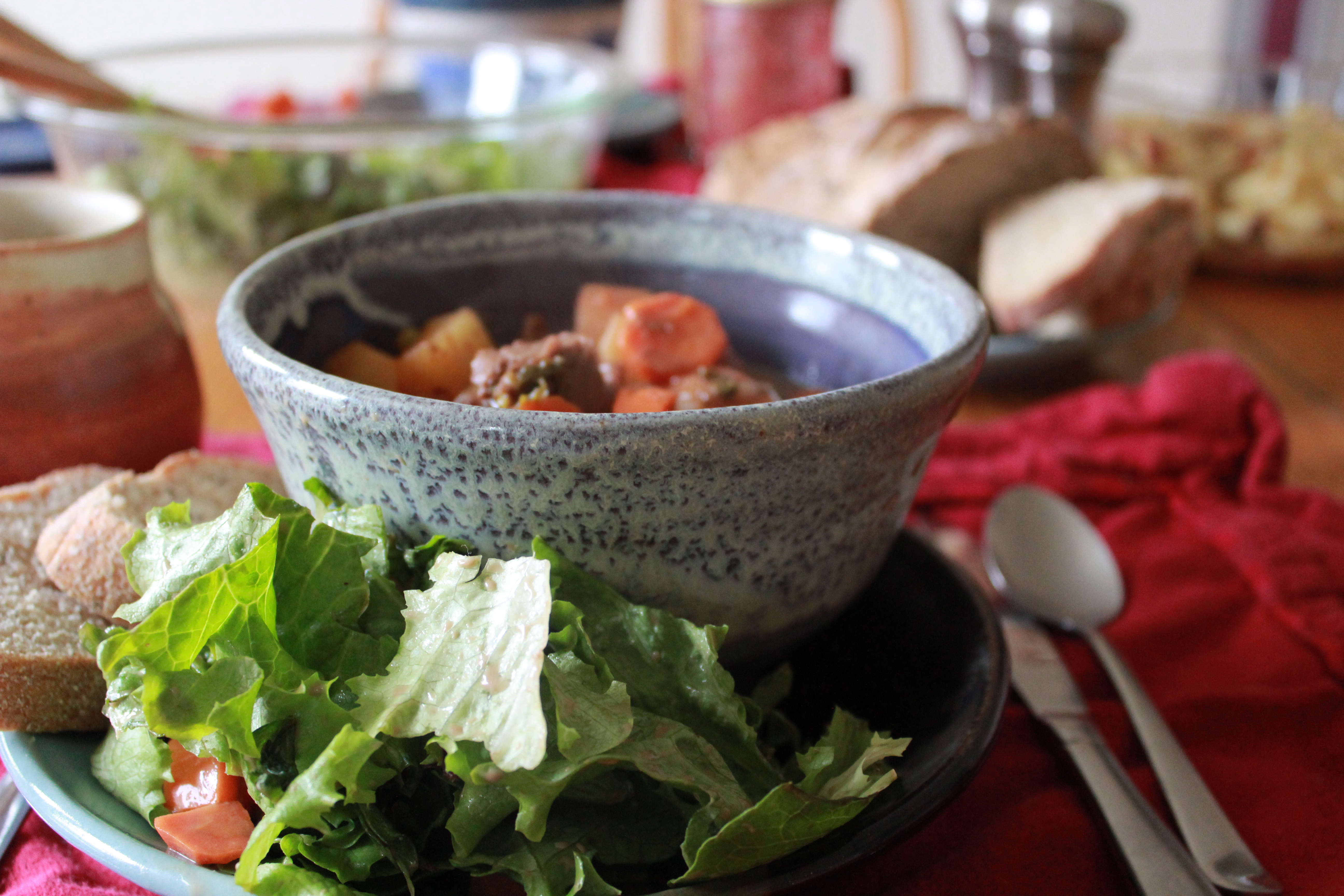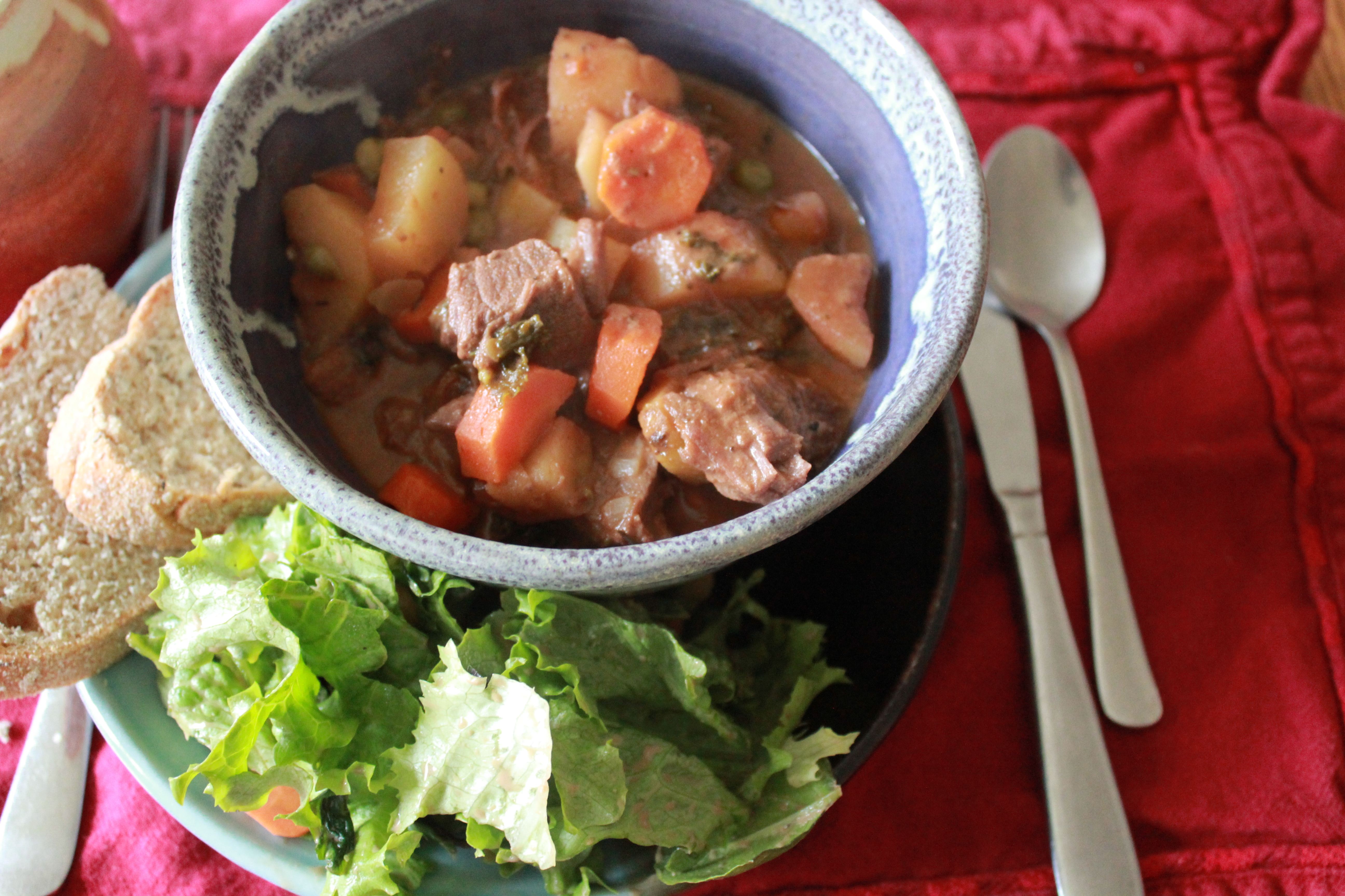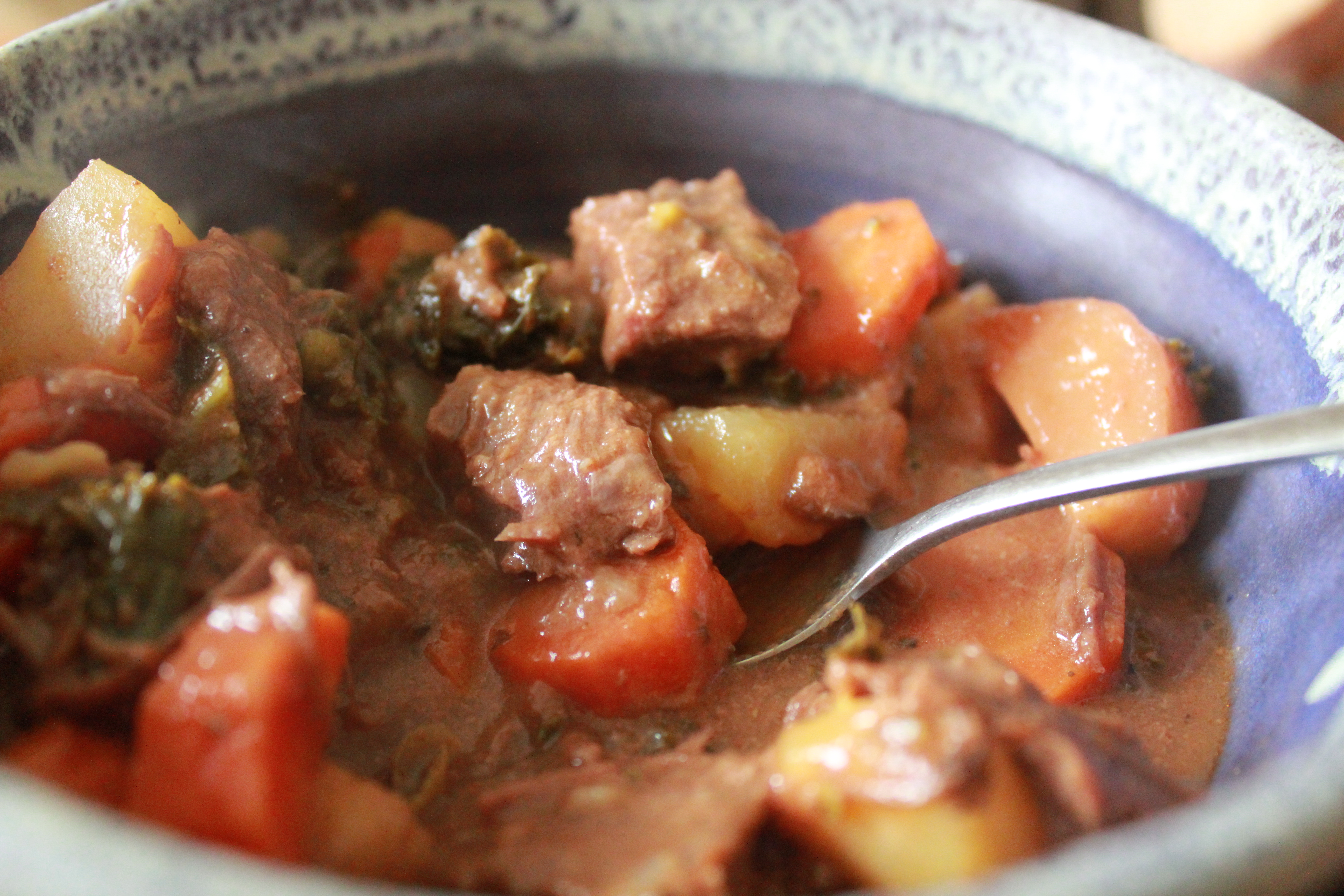 This is one of my favorite ways to cook elk or deer meat. It’s a thick stew, which cooks all day, sending warming fingers of savory goodness through my home all day long. The meat is tender and falls apart at the touch of a fork; the vegetables are surprisingly firm considering the cooking time. The sauce is thick and savory, perfect for mopping up with a thick slice of crusty bread.