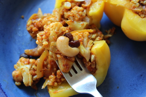 - Spoon the cauliflower mixture into the peppers, evenly dividing it between them. Sprinkle each pepper with an equal amount of the cashews and raisins.