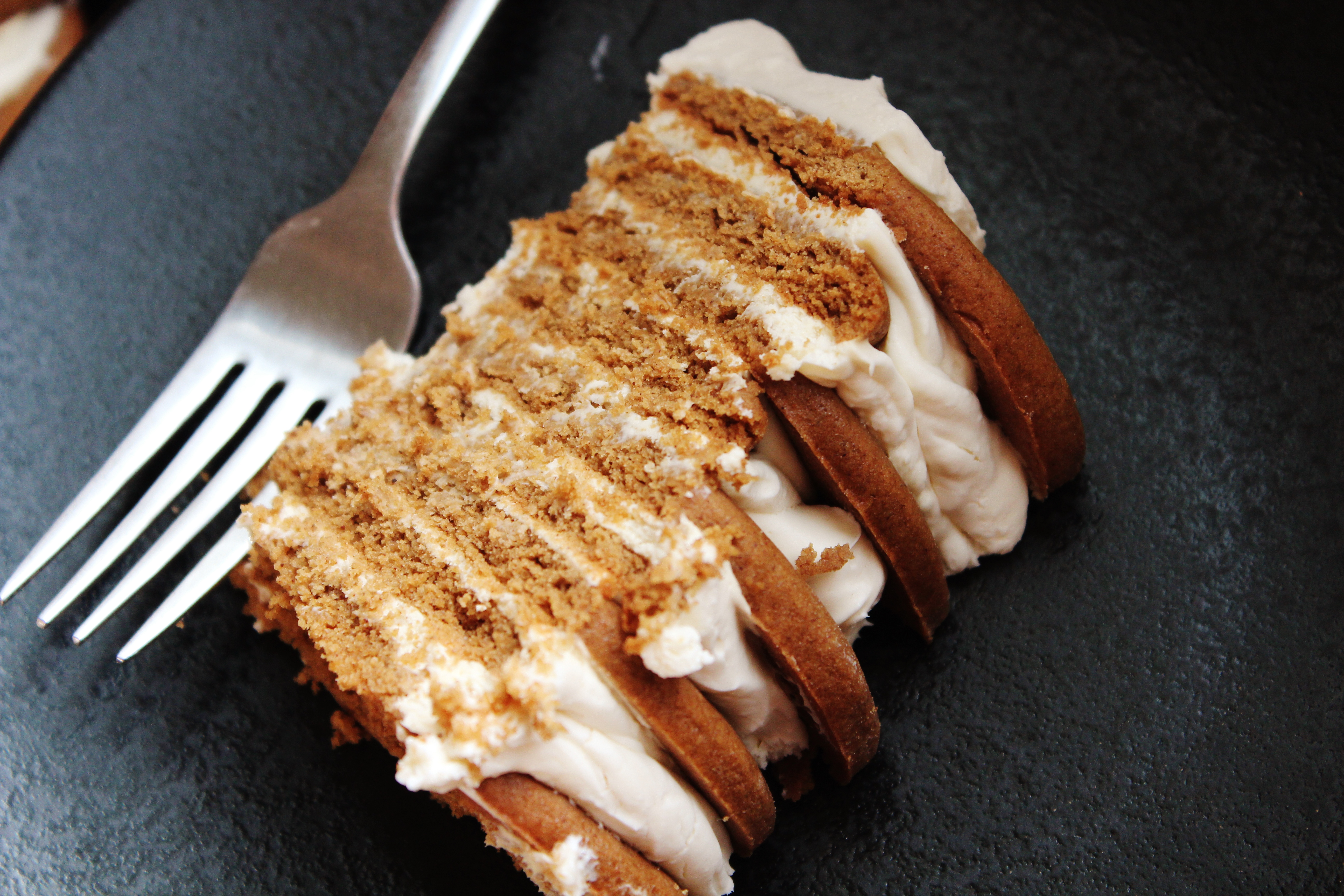 This called for a dessert to beat all desserts, and, after checking out from the library, and drooling over, Julie Richardson’s Vintage Cakes about thirty times, I knew it would be one of her recipes. (If the rather severe looking librarian from my branch is reading this, rest assured I did not actually drool on the book. Just next to it.) If you haven’t read Julie’s book yet, check it out. Even if you’re not going to make anything out of it. (Hopefully, I’m not the only person out there who periodically checks out recipe books with no intention of actually using them to cook something. To me, they’re like picture books for grownups.) Julie has definitely stolen my heart with this one. It’s full of gorgeous photographs of truly decadent delights, all introduced with fascinating stories about their origins. The first cake I made out of the book had a great little blurb about its history at the White House. Of all the cakes in the book, though, the Gingerbread Icebox Cake with Marscapone Mousse most intrigued me. Ginger cookies layered between mounds of fluffy mousse, placed in the fridge (icebox sounds so much nicer, doesn’t it?) overnight, and cut in tall slices of cookies and cream? Pass me a plate!