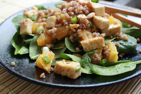 This healthy salad is flavorful and filling, and a complete meal. The chewy, salty tofu pairs nicely with the Asian dressing, sweet orange slices, and crunchy cashews.
