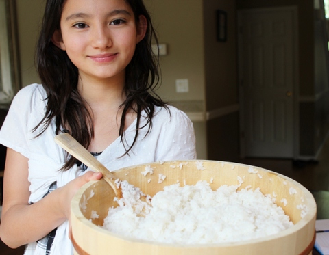 She highly recommended that I cook my rice in a rice cooker (and says even her relatives in Japan rely on them). I don’t have one, but I might look into getting one. The most interesting thing to me, though, was how she prepares and seasons the rice once it’s cooked. First, she dumps the hot rice into a large, wooden bowl, which helps to absorb the moisture. Then, she employs someone to fan the rice, blowing away the steam and helping cut down on moisture, as she stirs in the seasoned rice wine vinegar. She chided her husband, who played sous chef, for smashing the rice; the vinegar, she said, should be incorporated with a cutting motion, not stirred, which will make the rice smooshy.