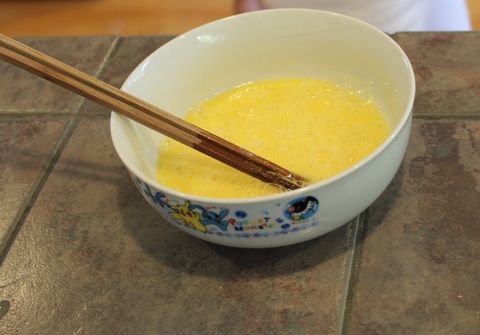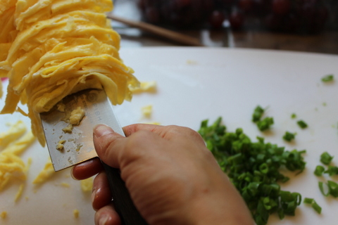 - Beat the eggs. Heat a small skillet over a burner on medium heat. Add the olive oil. Pour a third of the eggs into the pan and swirl to thinly coat the pan. Once the eggs have cooked through, about 2 minutes, remove from the pan and set aside. Repeat two more times, until all the eggs are cooked. Thinly slice the cooked egg sheets into strips.