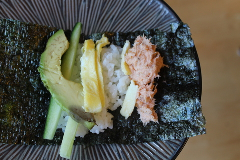 - Serve the ingredients buffet style and have diners assemble their own sushi: Take a piece of nori and place on your plate (or hand) rough side up. Spoon on 1/3 C or so of rice and spread out over the middle third of the nori. Place one or two avocado pieces, cucumber slices, and egg strips on the rice and top with a spoonful of the salmon mixture, then roll up like a burrito. Give each guest a small plate to create their own dipping sauce of wasabi and soy sauce. (For those unfamiliar with wasabi, warn them to go easy at first—unless you don’t like them, then tell them to heap it on.) Dip the sushi roll in the sauce before each bite. Enjoy!