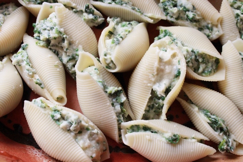 - Meanwhile, cook the pasta shells according to directions. Take them out a tad on the early side, while still very al dente, then immediately rinse in cool water to stop the cooking.