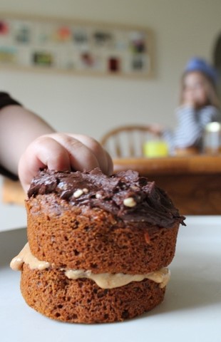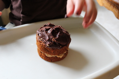 - If the tops of the cakes are highly rounded, slice off the top of four of the cakes to flatten them, just as you would for a large, double-layer cake. Frost the top of these four baby cakes with chocolate-peanut butter frosting (below). Place another cake on top of each of the frosted ones, then frost the top layer of each double-layer cake.