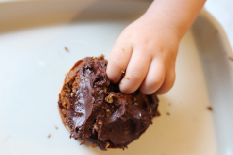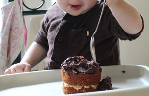 This boy was a champion nurser from day one, but eating has been a different story. He loves peanut butter (the Adams Peanut Butter jar sends him into ecstatics), but not a whole lot else. At least not consistently. So when it came to making him a birthday cake, I thought I would honor his love of PB. I also have a hard time making a real cake for such a small child; they just seem too young for all that sugar. When I first started this children’s birthday’s business, this resulted in some pretty nasty, last-minute adaptations. (Luckily my daughter was too young to remember some of these fiascos.) Not this year. I’ve been making some drop-dead delicious and super healthy banana muffins lately, and I had a flash of inspiration as I pondered baby boy’s first birthday treat. (And since I only had a few minutes to ponder, this fast and familiar recipe sounded good to me.) Plus, I’ve always loved the combination of peanut butter and bananas, so I thought with a little chocolate-peanut butter “frosting,” this would be the perfect thing.